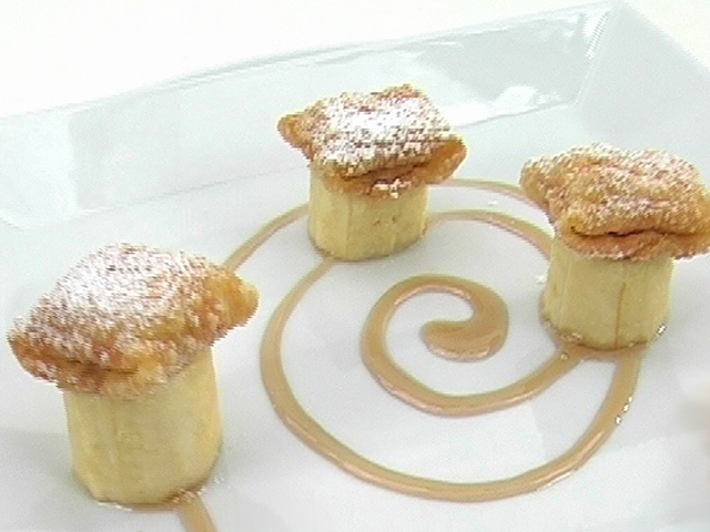 Нежный банановый десерт в сочетании с ликеровым сиропом.Состав:тесто — 4 листочка;сахарная пудра — 50 гр;сироп — 20 гр;сок одного лайма;кумкват — 2 ягоды;бананы — 2 штуки;немного пальмового сахара;растительное масло по вкусу.